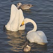Łabędź krzykliwy (Cygnus cygnus) - duży ptak wodny z rodziny kaczkowatych. Jednolicie biały, dziób żółty z czarnym czubkiem. Młode są szare, mają czerwone nogi i dziób bez czarnej plamy u nasady (inaczej niż u łabędzia niemego), szatę białą uzyskują w 3. roku życia. Jego okrzyki są charakterystyczne dla zimnych krajobrazów północy, zwłaszcza w czasie jesiennych przelotów. Dźwięki wykonywane zarówno w locie, jak i na wodzie, przypominają klangor żurawi. Wtedy to ptaki lecą w regularnych formacjach.