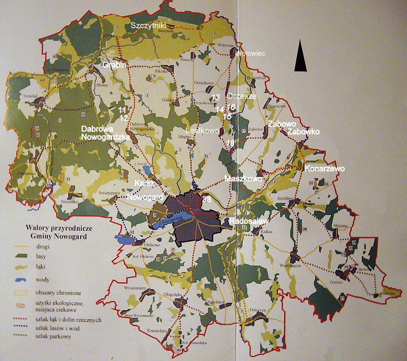 Szlak prowadzi nas przez główne doliny rzeczne środowiska malowniczych łąk i terenów podmokłych, siedliska wielu ciekawych gatunków ptaków. Doliny chronione są w ramach zespołów przyrodniczo-krajobrazowych. Dolina rzeki Sąpółnej i Dolina rzeki Wołczenicy Prowadzi po istniejących drogach i ścieżkach, również polnych i leśnych, stąd najłatwiej pokonać go na rowerze. Oryginalny opis trasy dotyczy startu w Nowogardzie. Mój opis dotyczy tego samego szlaku z tą ró;żnicą, że start jest w Szczytnikach. Ze Szczytnik kierujemy się drogą asfaltową w kierunku Wierzchów skręcając po ok. 1 km na Wołowiec drogą żwirową. Z Wołowca na południe jedziemy drogą na Orzysze i Lestkowo. Między Orzyszem i Lestkowem przejedziemy w bezpośrednim sąsiedztwie kilku użytków ekologicznych Zaskrońcowego Łozowiska (14), Rzekotkowego oczka (15) i Rzekotkowiska (16), w niewielkiej odległości znajduje się też Grzebiuszkowe oczko (13). Z Lestkowa kierujemy się na wschód leśnymi i polnymi drogami do Żabowa przejeżdzając na trasie przez most na Gardomiance i dolinę Sąpólnej i w pobliżu Pijawkowego Oczka (18). Z Żabowa na wschód do Żabówka (dwa pomnikowe dęby szypółkowe) i do Konarzewa. W Konarzewie warto zobaczyć duży park podworski z ładnie zachowanymi alejkami i dużymi 14 pomnikowymi drzewami. Z Konarzewa drogą do Maszkowa ( 3- dęby szypułkowe) przejeżdżając przez most na Sąpólnej. Z Maszkowa do Radosławia. Wokół Radosławia można zaobserwować ciekawe gatunki ptaków (derkacze i przepiórki). Z Radosławia kierujemy się do Nowogardu wzdłuż południowego krańca Szuwarów Nowogardzkich (38) do Karska. W Karsku warto zobaczyć obrośnięty bluszczem dąb szypułkowy oraz duży głaz narzutowy. Wyjeżdżając z Karska w kierunku Dąbrowy Nowogardzkiej zobaczymy jezioro Karsk, sztuczny zbiornik wodny z ciekawym ptactwem. Z Dąbrowy jedziemy do Grabina mijając po drodze Łozowisko Piaski i Mszar Piaski (12 i 11). W Grabinie skręcamy na betonówkę w kierunku północnym do Szczytnik, przejeżdżamy przez mostek na Wołczenicy i przez dolinę Wołczenicy dalej drogami leśnymi i polnymi dojeżdżamy do Szczytnik